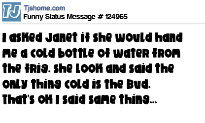 X says I asked Janet if she would hand me a cold bottle of water from the frig. she look and said the only thing cold is the Bud. That's ok I said same thing...