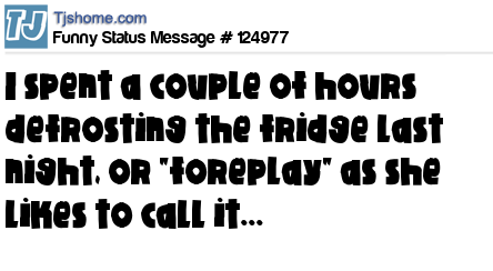 - # 135566 I had to defrost the fridge last night before bed. Or foreplay, as she calls it.