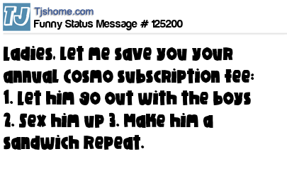 X says Ladies, let me save you your annual Cosmo subscription fee: 1. Let him go out with the boys 2. Sex him up 3. Make him a sandwich Repeat.