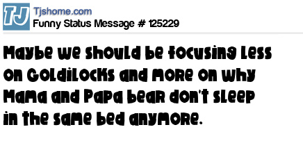 - # 122480 Maybe we should be focussing less on Goldilocks and more on why Mama and Papa bear don't sleep in the same bed anymore.