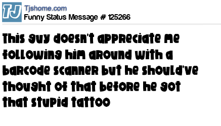 X says This guy doesn't appreciate me following him around with a barcode scanner but he should've thought of that before he got that stupid tattoo