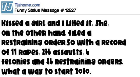 X is Kissed a girl and I liked it. She, on the other hand, filed a restraining order,So with a record of 11 rapes, 276 assaults, 4 felonies and 56 restraining orders, what a way to start 2010.