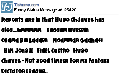 X says Reports are in that Hugo Chjavez has died....hmmmmm ✔ Saddam Hussein ✔ Osama Bin Ladden ✔ Moammar Gadhafi ✔Kim Jong IL ❒Fidel Castro ✔Hugo Chavez - Not good timesr for my Fantasy Dictator League...
