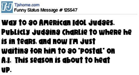 X Way to go American Idol judges. Publicly judging Charlie to where he is in tears, and now I'm just waiting for him to go "postal" on A.I. This season is about to heat up.