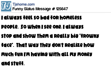 X says I always feel so bad for homeless people. So when I see one, I always stop and show them a really big "frowny face". That way they don't realize how much fun I'm having with all my money and stuff.