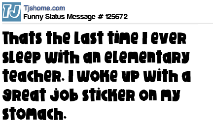 X Thats the last time I ever sleep with an elementary teacher. I woke up with a great job sticker on my stomach.