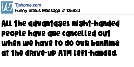 X says All the advantages right-handed people have are cancelled out when we have to do our banking at the drive-up ATM left-handed.