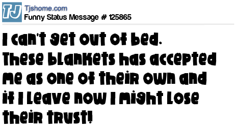 - # 206227 I can’t get out of bed. These blankets have accepted me as one of their own, and if I get up now, I’m afraid I’ll lose their trust.