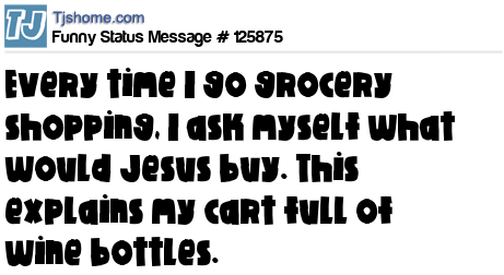 X says Every time I go grocery shopping, I ask myself what would Jesus buy. This explains my cart full of wine bottles.