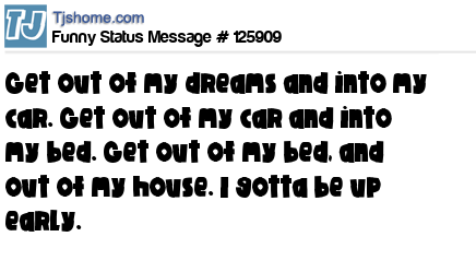 X says Get out of my dreams and into my car. Get out of my car and into my bed. Get out of my bed, and out of my house. I gotta be up early.