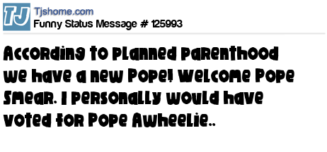 X is According to planned parenthood we have a new Pope! Welcome Pope Smear. I personally would have voted for Pope Awheelie..