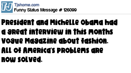 X is President and Michelle Obama had a great interview in this months Vogue Magazine about fashion. All of America's problems are now solved.