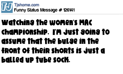 X says Watching the women's MAC championship.  I'm just going to assume that the bulge in the front of their shorts is just a balled up tube sock.
