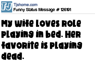 X says My wife loves role playing in bed. Her favorite is playing dead.