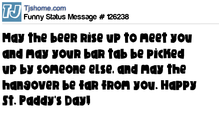 X May the beer rise up to meet you and may your bar tab be picked up by someone else, and may the hangover be far from you. Happy St. Paddy's Day!