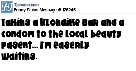 X is Taking a Klondike Bar and a condom to the local beauty pagent... I'm eagerly waiting.