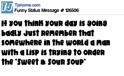 X says If you think your day is going badly just remember that somewhere in the world a man with a lisp is trying to order the "Sweet & Sour Soup"
