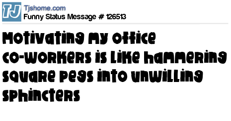 X Motivating my office co-workers is like hammering square pegs into unwilling sphincters