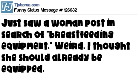 X Just saw a woman post in search of "breastfeeding equipment." Weird. I thought she should already be equipped.