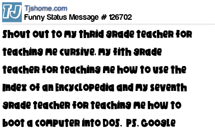 X says Shout out to my thrid grade teacher for teaching me cursive, my fith grade teacher for teaching me how to use the Index of an Encyclopedia and my seventh grade teacher for teaching me how to boot a computer into DOS. PS. Google says, "Hi!"