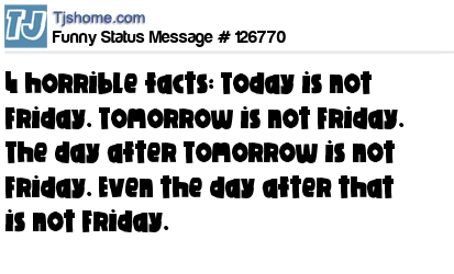 X 4 horrible facts: Today is not Friday. Tomorrow is not Friday. The day after Tomorrow is not Friday. Even the day after that is not Friday.