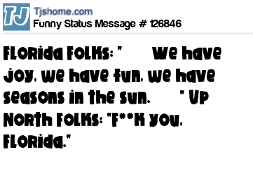 X Florida Folks: "♫ ♫ We have joy, we have fun, we have seasons in the sun. ♫ ♫" Up North Folks: "F**k you, Florida."
