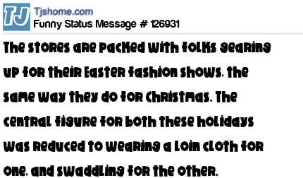 X The stores are packed with folks gearing up for their Easter fashion shows, the same way they do for Christmas. The central figure for both these holidays was reduced to wearing a loin cloth for one, and swaddling for the other.