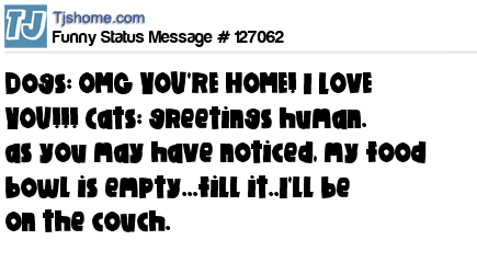 X says Dogs: OMG YOU'RE HOME! I LOVE YOU!!! Cats: greetings human. as you may have noticed, my food bowl is empty...fill it..I'll be on the couch.
