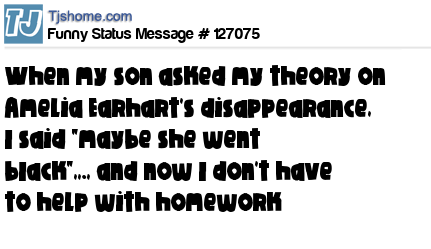 X  When my son asked my theory on Amelia Earhart's disappearance, I said "maybe she went bIack",,., and now I don't have to help with homework