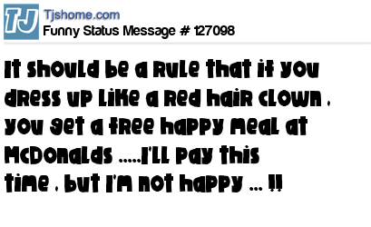 X It should be a rule that if you dress up like a red hair clown , you get a free happy meal at McDonalds .....I'll pay this time , but I'm not happy ... !!