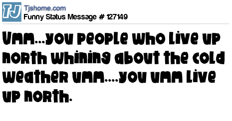 X Umm...you people who live up north whining about the cold weather umm....you umm live up north.