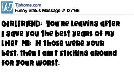 X says GIRLFRIEND: “You're leaving after I gave you the best years of my life?” ME: “If those were your best, then I ain’t sticking around for your worst.”