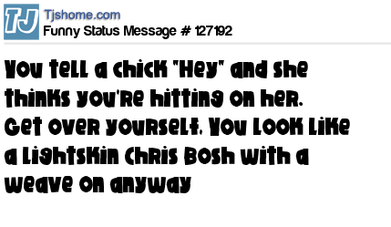 X is You tell a chick "Hey" and she thinks you're hitting on her. Get over yourself, You look like a lightskin Chris Bosh with a weave on anyway