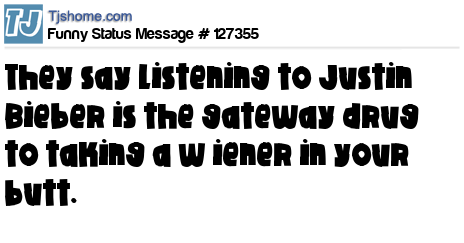 X says They say listening to Justin Bieber is the gateway drug to taking a w iener in your butt.
