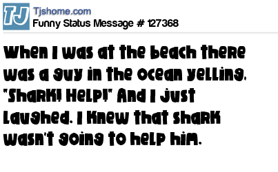 X says When I was at the beach there was a guy in the ocean yelling, "Shark! Help!" And I just laughed. I knew that shark wasn't going to help him.