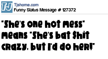 X is "She's one hot mess" means "She's bat $hit crazy, but I'd do her!"