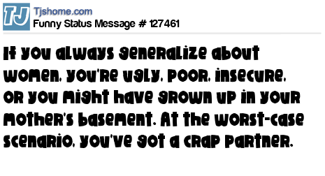 X If you always generalize about women, you're ugly, poor, insecure, or you might have grown up in your mother's basement. At the worst-case scenario, you've got a crap partner.