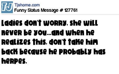 X says Ladies don't worry, she will never be you...and when he realizes this, don't take him back because he probably has herpes.