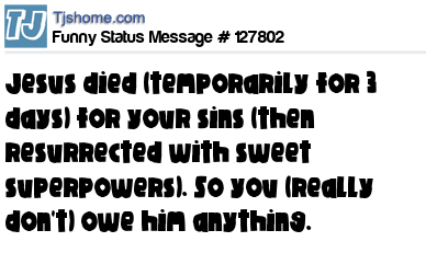 - # 34503 Remember Jesus died for our sins, so if you aren't sinning, he died in vain.