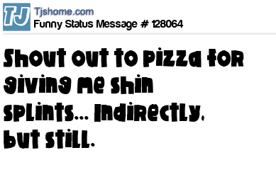 X says Shout out to pizza for giving me shin splints... Indirectly, but still.