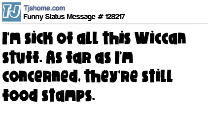 X I'm sick of all this Wiccan stuff. As far as I'm concerned, they're still food stamps.