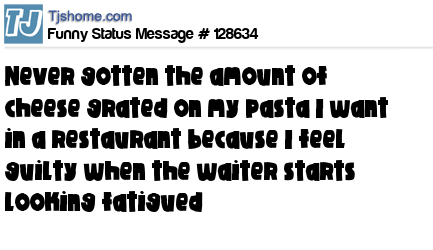 X never gotten the amount of cheese grated on my pasta I want in a restaurant because I feel guilty when the waiter starts looking fatigued