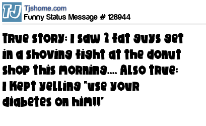 X True story: I saw 2 fat guys get in a shoving fight at the donut shop this morning.... Also true: I kept yelling "use your diabetes on him!!"