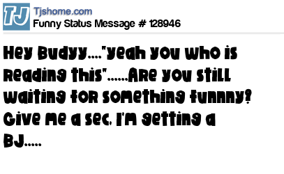 X Hey Budyy...."yeah you who is reading this"......Are you still waiting for something funnny? Give me a sec, I'm getting a BJ.....