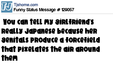 - # 74479 I can tell my girlfriend's Japanese because her genitals produce a forcefield that pixelates the air around them.