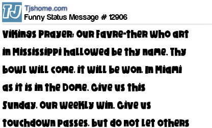 X Vikings Prayer; Our Favre-ther who art in Mississippi hallowed be thy name. Thy bowl will come, it will be won, In Miami as it is in the Dome. Give us this Sunday, Our weekly win. Give us touchdown passes, but do not let others pass against us. Lead us no