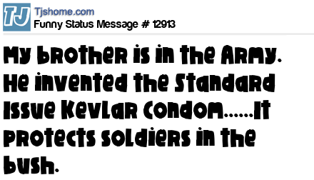 X says My brother is in the Army. He invented the Standard Issue Kevlar Condom......It protects soldiers in the bush.