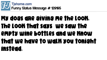 X says My dogs are giving me the look. The look that says “we saw the empty wine bottles and we know that we have to walk you tonight instead.”