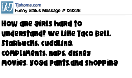 X is How are girls hard to understand? We like Taco Bell, Starbucks, cuddling, compliments, naps, disney movies, yoga pants,and shopping