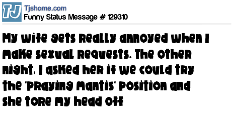X My wife gets really annoyed when I make sexual requests. The other night, I asked her if we could try the 'praying mantis' position and she tore my head off